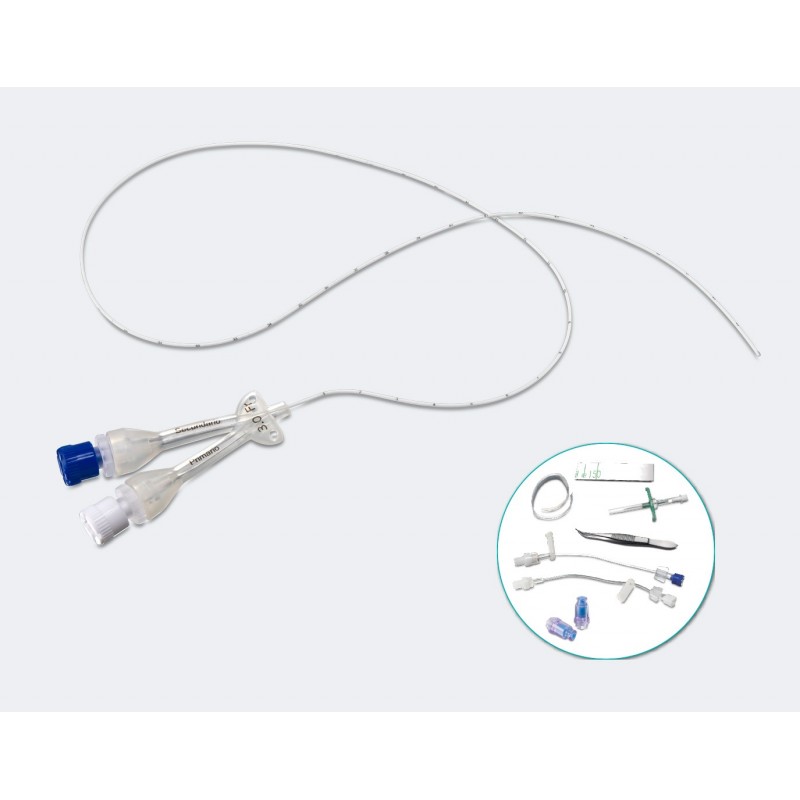 O kit inclui: 1 cateter percutâneo duplo-lumen com orifícios distais, 1 intodutor Silfash, fita métrica de 65 cm com conector, pinça de metal, 2 conectores intermitentse Luer-Lock (segurança), garrote de silicone 50 cm, prolongador Luer-Lock, prolongador Luer-Lock G.