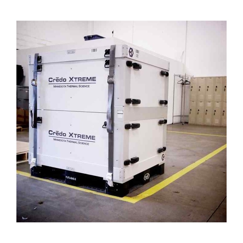 Nosso elevador de paletes Crēdo ™ Xtreme com controle de temperatura reutilizável, extremamente durável e reutilizável, é oferecido em dois tamanhos (meia e palete completo), ideal para consolidar grandes embarques de carga nacionais e internacionais. A tecnologia inovadora do Trammit BioThermal fornece um recipiente econômico com temperatura controlada que assegura o transporte seguro de produtos farmacêuticos / biotecnológicos de alto valor qualificados para manter a faixa de temperatura desejada por até 120 horas.