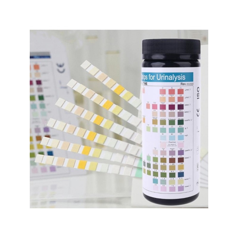 Ele testa urobilinogen, bilirrubina, cetona, creatinine, sangue, proteína, micro albumina, nitrito, leucócitos, glicose. gravidade específica, ph, ascorbato, cálcio