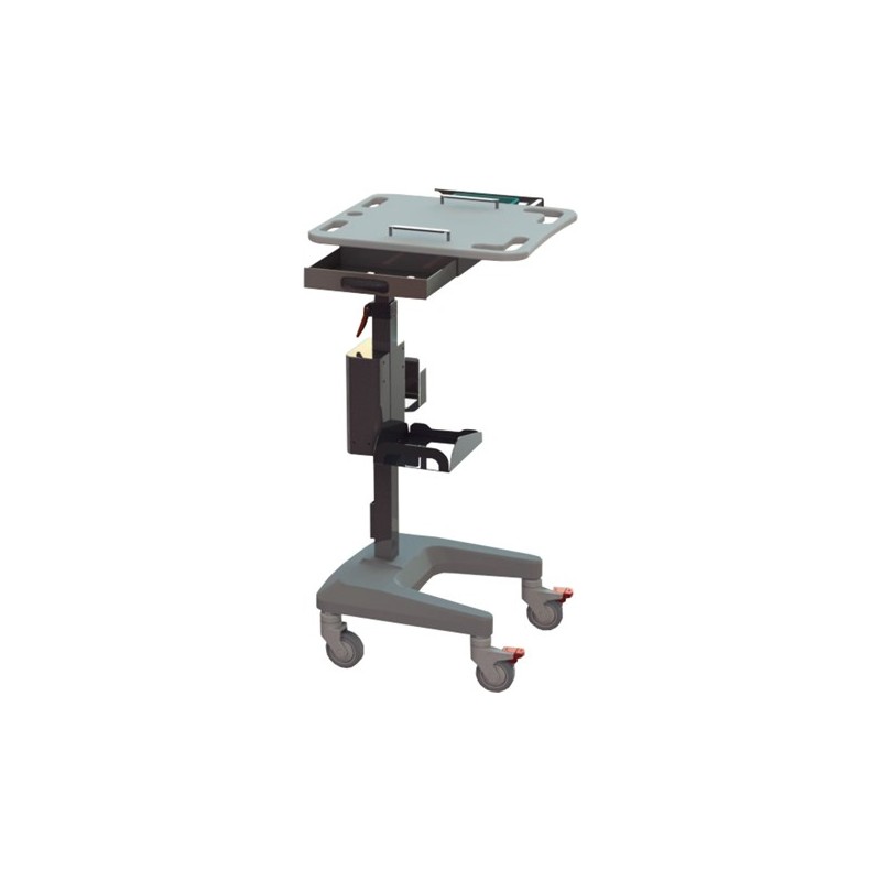 Carro confeccionado em aço inox, com elevação. Tampo ( bandeja) em polimero de alto impacto ABS com nano tecnologia antibacteriana, com dispositivo em aço inox que prende o equipamento evitando furtos e permintindo que o mesmo possa ser fechado após o uso sem sofrer avarias. Suporte par leitor de código de barras, colocado de maneira para facilitar o manuzeio.