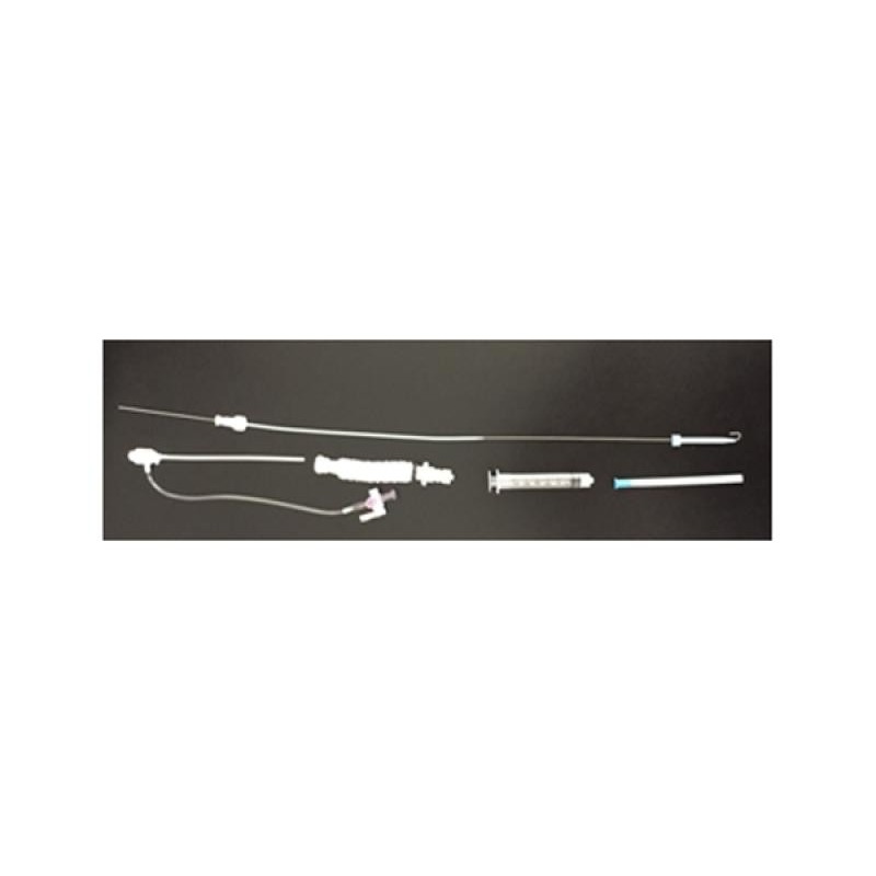 01 Introdutor com Trava Luer Lock, Válvula Hemostática e Porta Lateral (marcada pelo símbolo β na cor branca), Dilatador (corpo em azul com terminal branco na figura), Guia com ponta em J e ponta reta de 50cm, Manga Extensora de 60cm, Seringa e Agulha (à esquerda do Dilatador na figura).