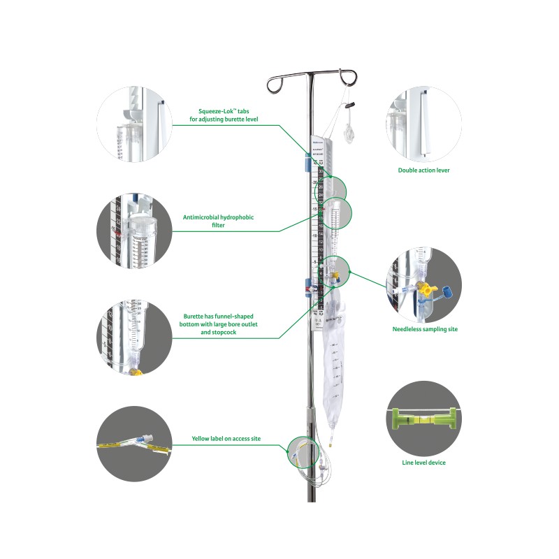 Bureta (câmara conta gotas) de 150 ml equipada com uma válvula antirrefluxo e orifício de ventilação com retenção microbiana.