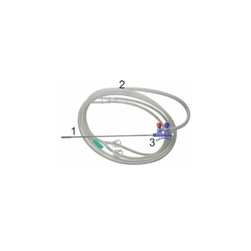 Fabricada em aço inoxidável com 5 mm de diâmetro e 8 orifícios na extremidade distal, conectada por rosqueamento a uma empunhadura de policarbonato que possui uma válvula ativada por mola e um tampão (pistão), ligada a uma mangueira dupla de PVC de 2.72 m que possui conexão universal para sistemas de drenagem e para conexão a 2 bolsas de infusão.