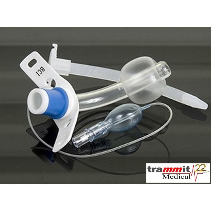 Cânula para traqueostomia em PVC termosensível, descartável e transparente com balão pré-moldado de baixa pressão e alto volume, balão azul de controle de pressão com válvula de segurança e encaixe para seringas Luer e Luer- Lock, ponta retraída atraumática, mandril auxiliar a introdução e limpeza com ponta olivar, linha radiopaca contínua, conector colocado, placa (asa) de fixação flexível e fita de fixação em espuma de “nylon” azul, com velcro nas extremidades permitindo melhor ajuste, estéril. “Látex Free” Não contém DEHP