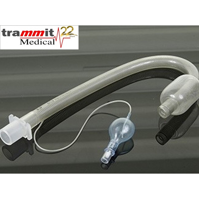 Cânula para Laringectomia em PVC termosensível, descartável e transparente, aramada (espiralada) com espiral em aço inox, extremo distal curvo com balão pré-moldado de baixa pressão e alto volume, ponta retraída e atraumática, balão azul de controle de pressão com válvula de segurança e encaixe para seringas Luer e Luer-Lock, conector universal colocado, uso oral ou via traqueostomia, estéril, “Latex Free” - Não contém DEHP