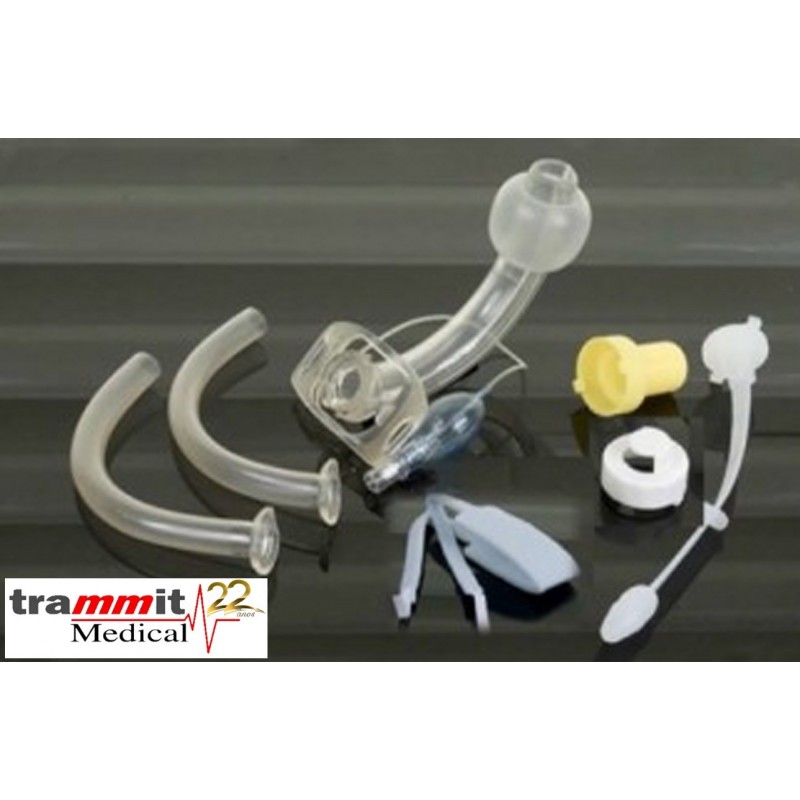 Conjunto: 1 cânula exterior para traqueostomia, em PVC termosensível descartável e transparente, placa (asa) de fixacão flexível, 2 cânulas internas; 1 tampa de proteção anti-catarro; 1 obturador guia mandril; 1 conector para oxigênio; 1 fixador em espuma de "nylon" azul com velcro nas extremidades permitindo melhor ajuste, estéril.
