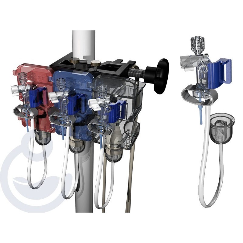 - Suporte com sistema modular com cores diferentes. - Cabo embutido na placa e suporte com trava de segurança. - Dispositivo de flush pocisionado na vertical, com dois modos de atuação: puxar ou apertar. - Torneira do zero angulada. - Torneira valvulada para coleta de sangue. - Conector com cúpula protetora contra respingos. - Trava de segurança que garante a montagem do transdutor na placa na posição correta.