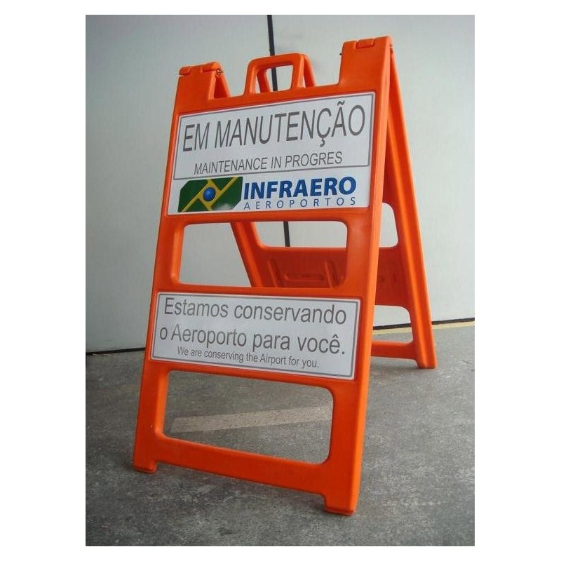 Cavalete confeccionado em polietileno de alta densidade, em cores diversas, com informações e pictogramas para sinalização e identificação temporária de áreas de fluxo de pessoas e veículos (peso aproximado do conjunto – 4,1kg).