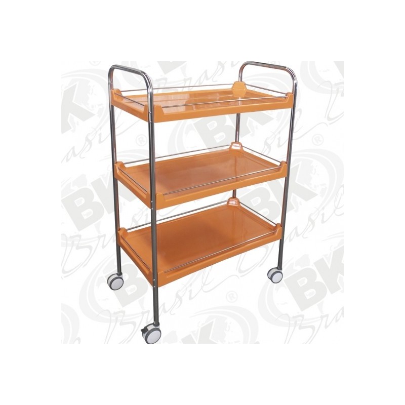 Carro para transporte composto de 03 prateleiras em fiberglass de alta resistência durabilidade, com acabamento em gel coat isoftálico; estrutura em tubos de aço inoxidável 7/8" x 1,2 mm de parede e varandas em tubos de aço inoxidável maciço espessura 5/16", acabamento polido. Montado sobre rodízios de 05" sistema duplo rodado, com freios em diagonal.