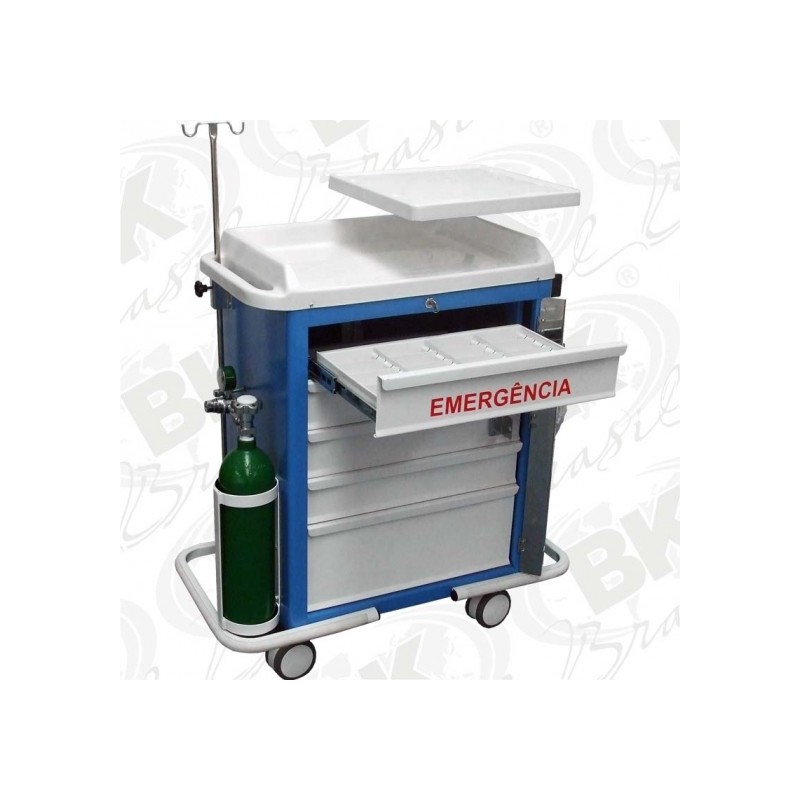 O CARRO DE EMERGÊNCIA BKCE 011 apresenta gabinete em chapa aço com cantos arredondados dotado de 05 gavetas; recebe acabamento com decapagem, jateamento e pintura eletrostática a pó com secagem em estufa. As gavetas possuem puxadores integrados, sem porcas ou parafusos, e são dotadas de guias deslizantes telescópicas. O gabinete possui proteção em PVC contra impactos laterais e frontais e 04 rodízios com banda de rodagem dupla, diâmetro de 04”, sistema de travamento, os quais são dotados de rolamentos internos que facilitam sua locomoção e manobras.